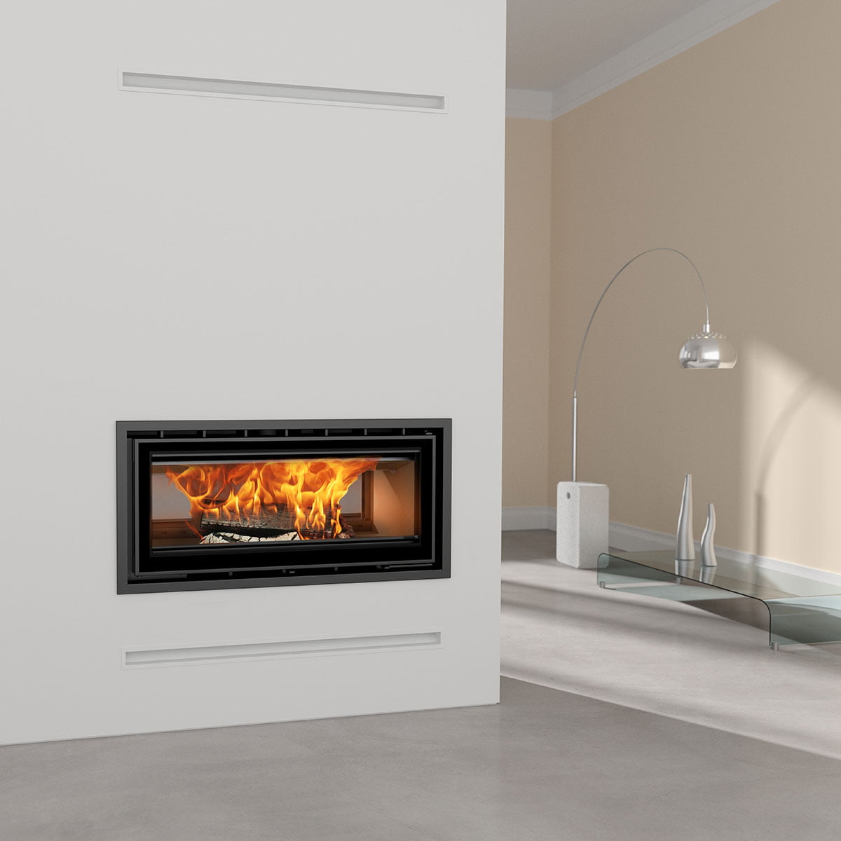 The Linea 100 Duo Insert wood burning fireplace has a minimalist state-of-the-art design, with its simplistic clean sharp lines and crisp edges. Its impressive dual opening doors ensure an uninterrupted view of the flames and are easily opened with its removable handle. Dual fans heat both front and back of the fireplace. With its transparent design, this fireplace makes for the ideal room divider.